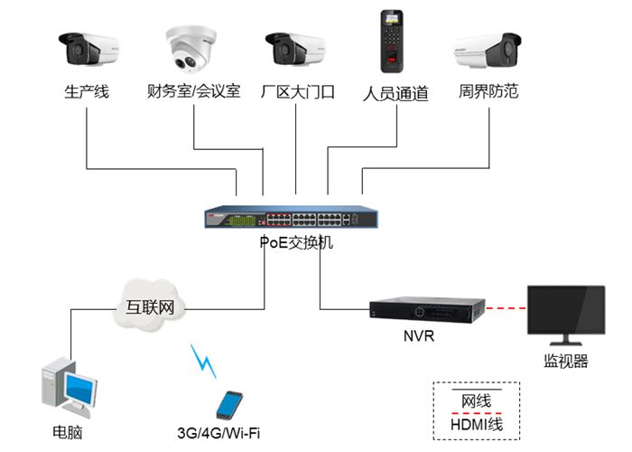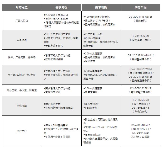針對(duì)工廠(chǎng)的環(huán)境,我們?cè)O(shè)計(jì)了一套完善的安全監(jiān)控系統(tǒng),為工廠(chǎng)提供了一套可實(shí)施性較高的監(jiān)控解決方案。 本次方案的亮點(diǎn)在于應(yīng)用了剛發(fā)布不久的海康威視智能警戒攝像機(jī)。該攝像機(jī)作為海康威視AI Cloud邊緣智能的一員,是智能IPC家族中的明星產(chǎn)品,采用適用于視頻監(jiān)控場(chǎng)景的深度學(xué)習(xí)硬件及算法,具備精準(zhǔn)報(bào)警、實(shí)時(shí)警戒、快速回查三大功能。 01 配單選型 02 點(diǎn)位設(shè)計(jì) 下面列舉幾個(gè)具體的點(diǎn)位分析 周界防范 針對(duì)工廠(chǎng)的周界防范,由于周界及圍墻范圍較大,區(qū)域較廣,一般使用高圍墻包圍,采用??低?/span>智能警戒攝像機(jī),精準(zhǔn)報(bào)警,有效降低誤報(bào)率,當(dāng)場(chǎng)檢測(cè)到人或車(chē)時(shí)立即發(fā)出白光報(bào)警震懾,并實(shí)時(shí)遠(yuǎn)程上傳報(bào)警消息至手機(jī)或電腦,便于及時(shí)采取防范措施。 廠(chǎng)區(qū)大門(mén)口 對(duì)于廠(chǎng)區(qū)大門(mén)口,進(jìn)出車(chē)輛及來(lái)往人員十分眾多。這里我們推薦400W星光筒型攝像機(jī)。對(duì)門(mén)口進(jìn)行監(jiān)控,星光級(jí)照度,滿(mǎn)足日夜監(jiān)控的需求,適用于重要點(diǎn)位的監(jiān)控。 人員出入口 針對(duì)廠(chǎng)區(qū)人員管理,主要包括人員進(jìn)出權(quán)限管理和考勤打卡,這里推薦指紋門(mén)禁考勤一體機(jī),結(jié)合門(mén)禁管理與考勤管理于一體,安裝簡(jiǎn)單,適用于主要出入口的人員管控。 生產(chǎn)線(xiàn) 廠(chǎng)區(qū)生產(chǎn)線(xiàn)作為工廠(chǎng)里的重要場(chǎng)景之一,在監(jiān)控系統(tǒng)中也十分關(guān)鍵。針對(duì)生產(chǎn)線(xiàn)的監(jiān)控,我們主推??低?span style="max-width: 100%; box-sizing: border-box; color: #040404; overflow-wrap: break-word !important;">星光級(jí)海螺/筒型攝像機(jī),該產(chǎn)品主要應(yīng)用于安防系統(tǒng)重點(diǎn)區(qū)域的監(jiān)控,其優(yōu)質(zhì)的成像效果和強(qiáng)大的環(huán)境適應(yīng)性,可以保證對(duì)整個(gè)生產(chǎn)線(xiàn)進(jìn)行全天候的監(jiān)控。 會(huì)議室/財(cái)務(wù)室 類(lèi)似于財(cái)務(wù)室/會(huì)議室等區(qū)域是廠(chǎng)區(qū)的重點(diǎn)區(qū)域之一,人員密集,活動(dòng)頻繁,且涉及到許多企業(yè)安全信息。我們推薦音頻海螺型攝像機(jī),外形小巧,功能強(qiáng)大,出廠(chǎng)自帶麥克風(fēng),支持音頻錄制,從而協(xié)助企業(yè)進(jìn)行內(nèi)部的信息安全管理, 03 系統(tǒng)拓?fù)?/strong> 04 系統(tǒng)亮點(diǎn) 全面防范:整套工廠(chǎng)視頻監(jiān)控系統(tǒng),覆蓋廠(chǎng)區(qū)周界、走廊、辦公室、生產(chǎn)線(xiàn)等方位,能全方位保障工廠(chǎng)安全??紤]到一般廠(chǎng)區(qū)較大,周界防范采用智能警戒攝像機(jī),精準(zhǔn)報(bào)警,有效降低誤報(bào)率。 簡(jiǎn)單方便:本方案中大多為PoE設(shè)備。PoE設(shè)備只需布網(wǎng)線(xiàn),無(wú)需鋪設(shè)電源線(xiàn),省去部署供電系統(tǒng)和線(xiàn)路所需的時(shí)間、精力和花銷(xiāo)。 維護(hù)成本低:相比與非PoE方案,拓?fù)涔?jié)點(diǎn)少,維護(hù)概率低。 遠(yuǎn)程監(jiān)控:通過(guò)螢石云平臺(tái),可以實(shí)時(shí)查看現(xiàn)場(chǎng)情況,回溯歷史錄像。布防時(shí)間內(nèi),當(dāng)警戒區(qū)域有人/車(chē)進(jìn)入,事件消息將第一時(shí)間推送至手機(jī)客戶(hù)端,管理人員可以通過(guò)手機(jī)查看現(xiàn)場(chǎng)情況并及時(shí)做出響應(yīng)。 當(dāng)然,具體場(chǎng)景,具體分析,畢竟大家大多數(shù)是經(jīng)驗(yàn)豐富的老司機(jī),場(chǎng)景規(guī)劃和產(chǎn)品選擇已經(jīng)熟門(mén)熟路了,比小編厲害多了!