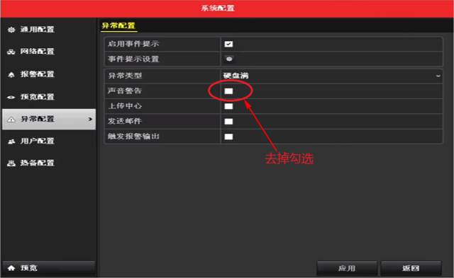 進(jìn)入到系統(tǒng)配置-異常配置—異常類型,將異常類型每個選項,對應(yīng)的聲音警告打鉤取消,點擊應(yīng)用。去掉哪個類型,錄像機不再報警,那就說明是該原因引起的報警,再針對原因做相應(yīng)處理。